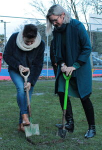 Principal Patrice O’Connor and board of trustees chairwoman Jane Cooper turned over the first soil at the construction site on Tuesday morning.