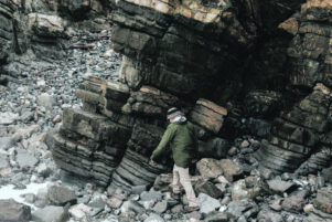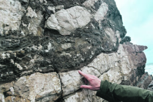 Hollis said he had been studying the K-Pg boundary for most of his two-decade career, dwelling on the exposure boundary seen in Tora’s rock, with its unique and visibly distorted bedding. Lumps of limestone were uplifted rather than lying flat like the other layers in the rock.