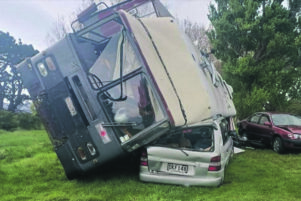 A gust of wind flipped a house bus, injuring the occupants and crushing two vehicles. PHOTOS/SUPPLIED