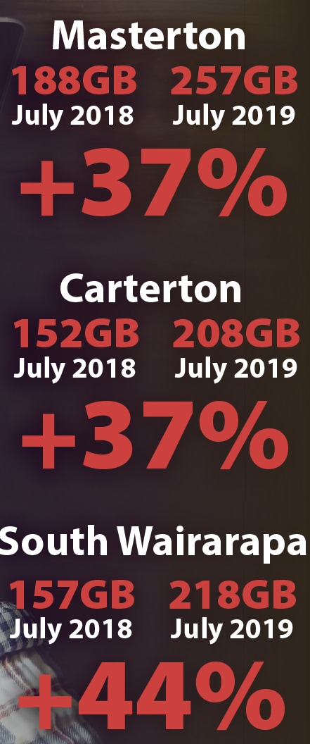The average Wairarapa home used 218 gigabytes of data in July 2019 on the Chorus network compared with 157GB a year earlier showing a 39 per cent increase.