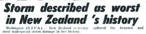 Communications with other New Zealand centres were cut, electricity supplies completely disrupted, schools closed, homes flooded and hundreds of trees and branches crashed down over roadways bringing down scores of power and telegraph poles.
