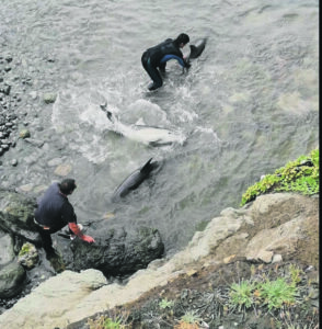 They had finished up for the morning at about 11am when they noticed several dolphins stuck up against rocks on the coastline.