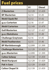 A quick scan of the region’s petrol stations on Wednesday showed BP Martinborough and g.a.s. Masterton seemed to share the lowest prices, charging $2.099 for 91 and $1.399 for diesel.