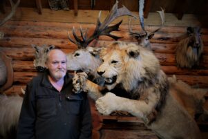Every piece in his 600-strong collection of stuffed exotic animals is interesting to him though and the log cabin also boasts a green-eyed leopard, a vast array of antelope and other large game bucks, and a small pride of lounging lions.
