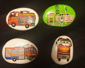 Over the past week members of the brigade have hidden four rocks with fire engines and the fire station painted on them by artist Ebonee Wilson at various locations around Greytown.