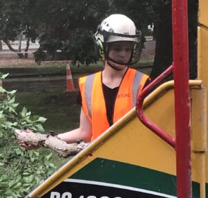 Eighteen-year-old Samantha Hallam stepped out of her job at Z Energy Masterton for her second day of work experience with Wairarapa Treescaping. She likes the outdoors so was happy to be with the crew.
