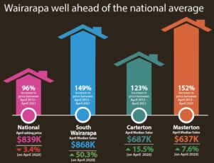 In the nine years since April 2012, prices have gone up 123 per cent in Carterton, 152 per cent in Masterton and 149 per cent in South Wairarapa. These increases are well above the national average price rise of 96 per cent for the same period.