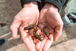Stotter sorts through the weed, crabs and other marine species to count the puerulus before releasing them back into the water.