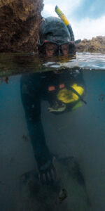 Dean Stotter and Jeff Forman wade out to the rocks to survey puerulus. PHOTOS/LANA YOUNG, NIWA