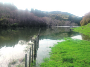 Logs float in water from the dammed Kaiwhata River and surround the woolshed at Kummerstein farm. PHOTOS/SUPPLIED