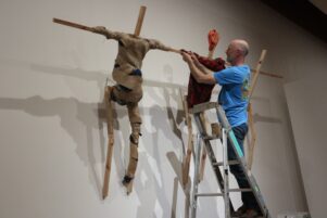 Richard Reddaway putting up his hessian wooden sculpture for the upcoming exhibition at Aratoi.