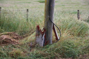 A wooden power pole on Lake Ferry Rd was snapped in a crash which has landed a South Wairarapa man in hospital with serious injuries. PHOTOS/HAYLEY GASTMEIER