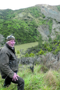 Gavin Eldridge of Stansborough Farm takes to the water on the lake created after a massive slip dammed the Kaiwhata River.