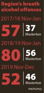 According to the data police provided under an Official Information Act request, there were 57 people who failed breath-alcohol tests from November to January of 2017-18 [Carterton 12, Featherston one, Greytown three, Martinborough four, and Masterton 37].