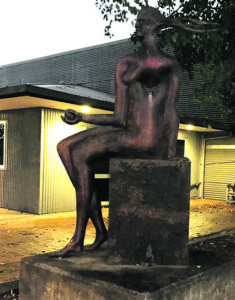Sculptor Paul Dibble has his ‘Garden of Delights’ included in the trail. It is located on the corner of Queen and Smith sts. It is part of a series of seated figures Dibble began in 1998. The woman has her arm outstretched holding an apple.