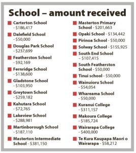 Masterton Intermediate School, the next highest, was set to receive $381,150, with Kuranui College in line for $311,157, Lakeview School $288,981, and Greytown School $259,182.