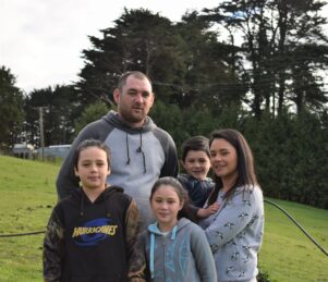 Emma Mitchell and her husband, Brian, with their children Kingston, 10, left, Olivia, 8 and Kade, 4, on their Alfredton farm, Ngapuka.