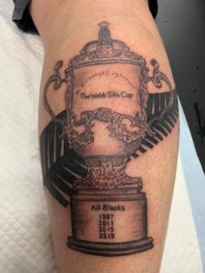 The Carterton man made international headlines after he got a tattoo of the Webb Ellis Cup marked up with a predicted All Blacks 2019 win alongside the 1987, 2011 and 2015 victories