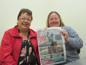 Roz Southey and Jenny Booth, two of Zed Em’s owners, with the Australian newspaper that featured Zed Em on its front cover after the Grand Annual Steeplechase. PHOTO/ELI HILL