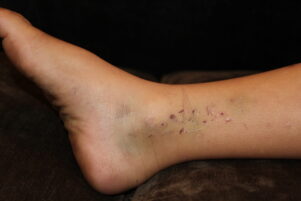 He suffered scrapes and bruises along the left side of his body, and an x-ray later found a cracked bone below his knee, which is expected heal on its own.