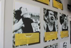 Adorning the walls are track and field stars – a shoutout to Harris’ “fulltime” gig as an athletics coach.