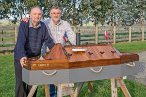 Ken Scadden, left, maritime expert and author of Rugged Coast, Rough Seas, did not live to attend the launch of his book in 2016. He is pictured with his brother, Brian Scadden, maker of a suitably nautical coffin.
