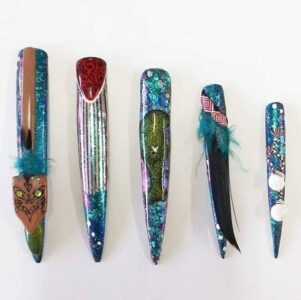 Each of her five nails told part of a story and were connected by similar materials such as paua shell and feathers.