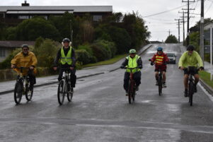 The Carbon Neutral NZ group joined Treadwell and her crew of cyclists, and after “endless” planning and changes, a group fluctuating up to nine cyclists, but more like six as they reached Masterton, cycled through on e-bikes powered by solar panels on the back of their command centre van.