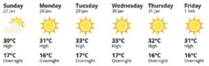 Taking Masterton as an example the average daily high temperature in January is 24C so a heat wave is five days with high temperatures of 29C or more.