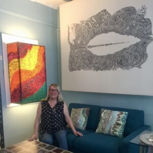 Julie Donvin-Irons, with her work decorating the room’s walls.