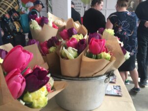 The inside portion of the market is packed with smiling people who amble their way past sausages, olive oils, flowers, books by local authors, pastries, honey, kombucha, chutneys, vegan treats, and cheeses.