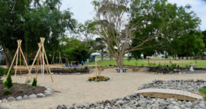 The garden included, among other elements, an outdoor classroom space, a dry river bed to be filled with tussock grasses, a butterfly garden, a rainbow of flowers, natives and edible plants, and wooden tepee structures that would eventually be wrapped in vines.