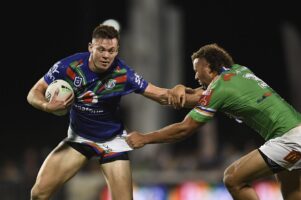 Rocco Berry pushes off a Raiders defender in the Warriors loss to Canberra on Friday night. PHOTO/GETTY IMAGES