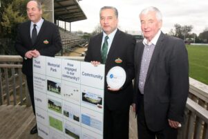 Wairarapa-Bush Rugby Union CEO Tony Hargood, left, then Wairarapa-Bush Rugby Union chairman Paora Ammunson, and Heartland Wairarapa chairman Bob Francis show off their plans for Memorial Park in 2014. PHOTO/FILE