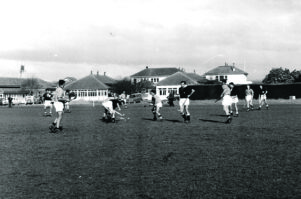 Kevin Percy, second from right, scoring a goal against the Japan national team at Queen Elizabeth Park in August 1961. PHOTOS/WAIRARAPA ARCHIVE